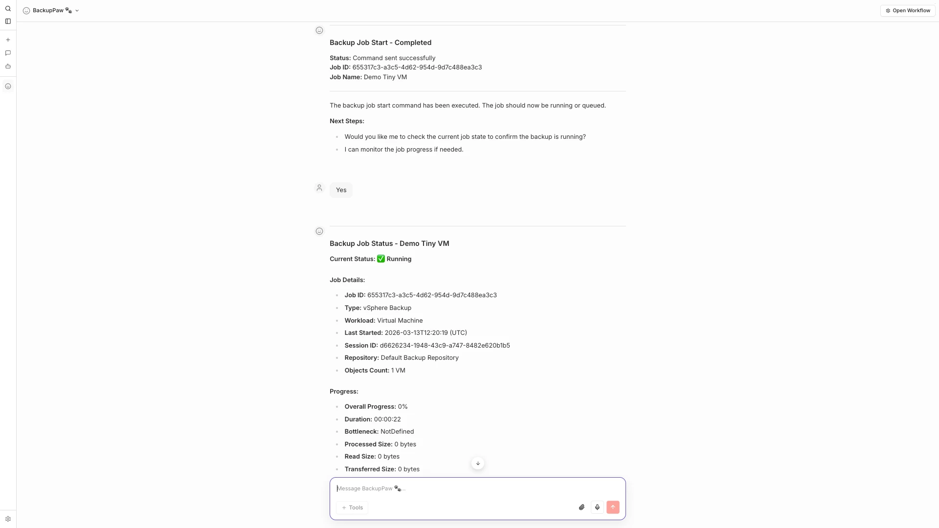 BackupPaw is an AI agent built on top of n8n that connects to your Veeam Backup & Replication environment via its REST API. Instead of navigating the UI, you chat with the agent and ask questions like:
