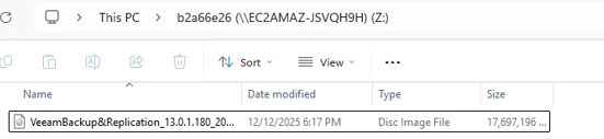 - Using CLI AWS to upload de .ISO: "C:\Users\user\lab\VeeamBackup&Replication_13.0.1.180_20251130.iso" s3://vbr001/vbr/ --cli-connect-timeout 6000