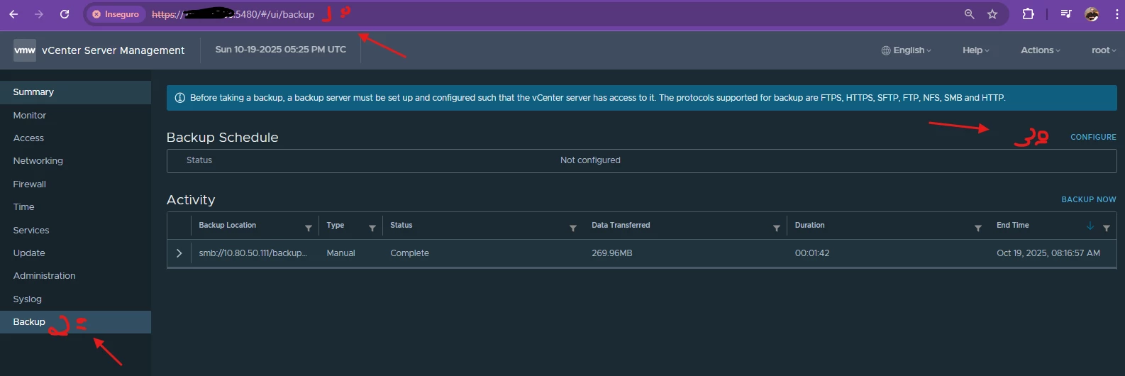 First of all, you must create a destination for the backup file, the destination could be accessed by several protocols, the protocols supported for backup are FTPS, HTTPS, SFTP, FTP, NFS, SMB and HTTP.