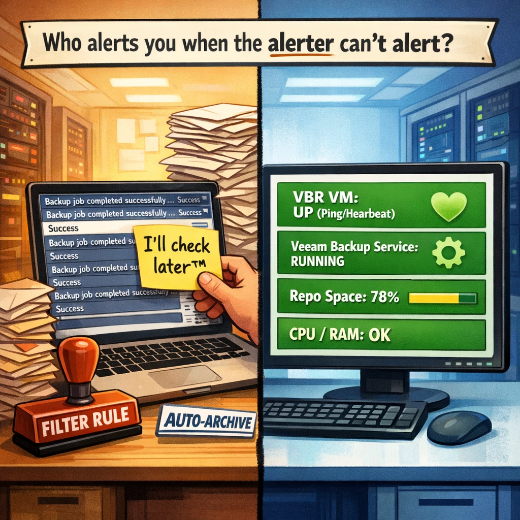 But don’t lose sight of one important factor: “Who alerts you when Veeam itself can’t alert?”
