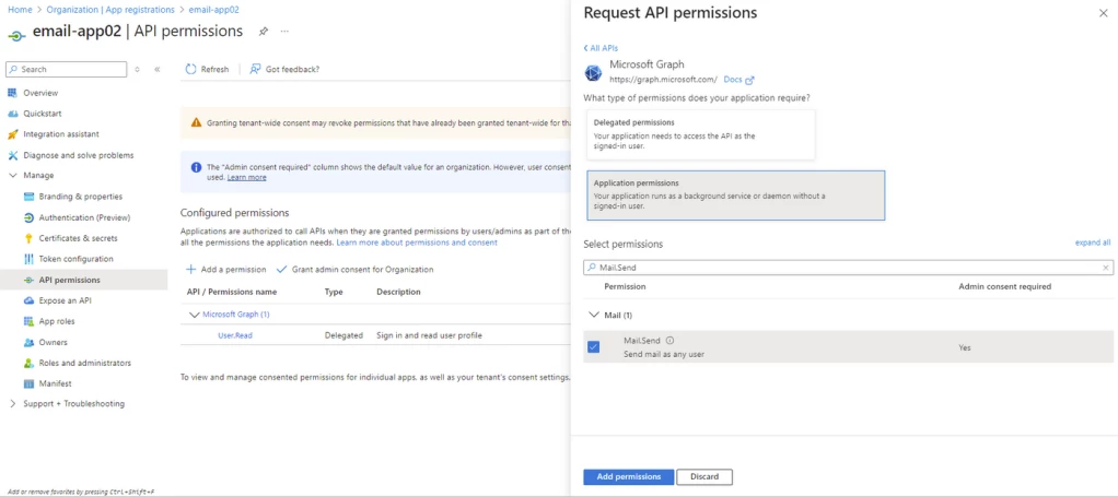Next, you still need the permission/consent for Mail.Send: