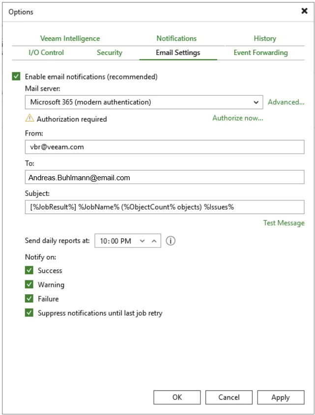 Details: https://helpcenter.veeam.com/docs/vbr/userguide/pve_email_settings.html?ver=13