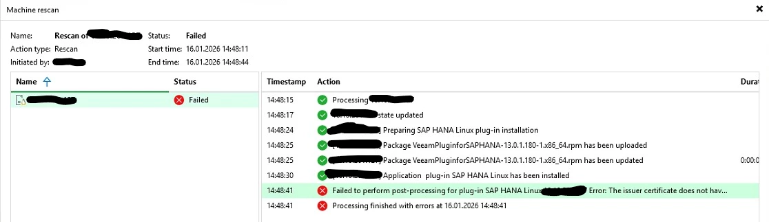 After upgrading a customer environment from Veeam Backup & Replication v12 to v13.0.1.1071, everything initially worked as expected. Existing SAP HANA plug‑ins on several systems (still in v12) continued to run without issues.