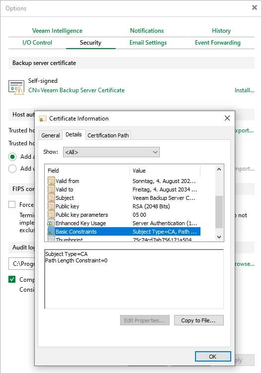 It’s easy. Just click “Install” for the backup server certificate in the general options security tab and roll out a new self-signed. This will have the additional field.