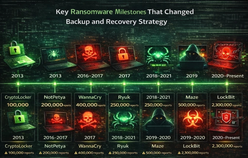 Understanding hacker thinking becomes much clearer when we look at how ransomware evolved over time. Each major ransomware family didn’t just introduce new malware techniques — it exposed very specific weaknesses in how organizations designed, protected, and trusted their backup environments.