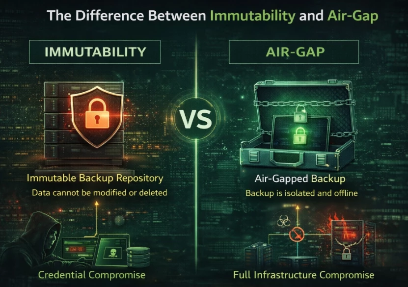 Air-gap, on the other hand, means backups are physically or logically isolated from the production environment.