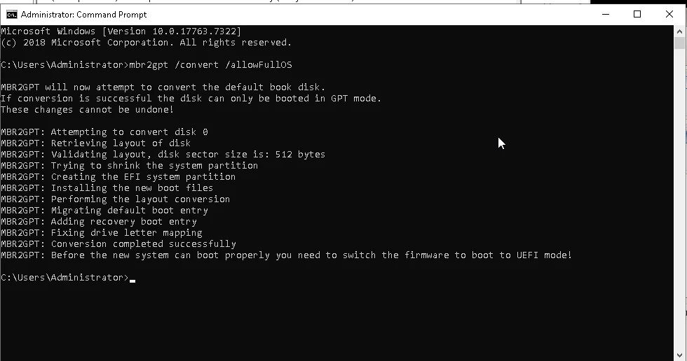 Before enabling EFI BIOS, you must convert the MBR boot partition to GPT.