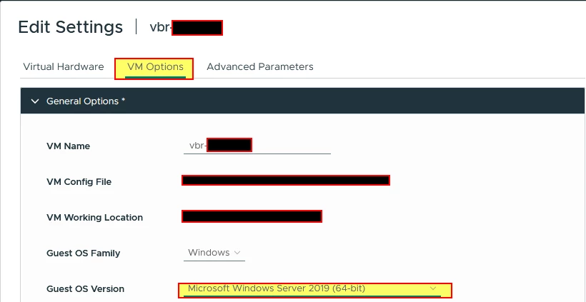 4. Expand the General Options section and ensure that the Guest OS is set to Windows Server 2016 or higher (or Windows 10/11).