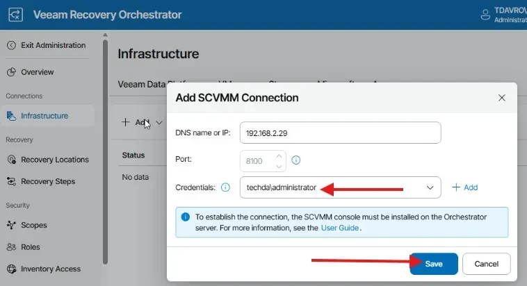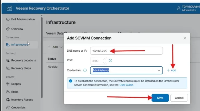 Enter the SCVMM connection parameters. Here you can use the DNS or IP address and then specify the credentials. Do not forget to click on Save.