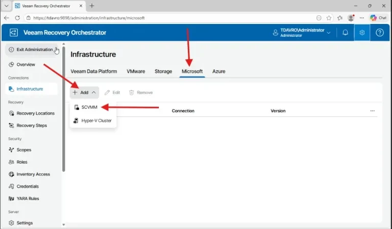 Note: If the SCVMM server or standalone cluster that you want to connect to Orchestrator is added to a backup server, you must first upgrade the server or cluster to Veeam Backup & Replication version 12.3. Otherwise, the server or cluster will no longer be able to connect to the backup server, which may affect data protection. Also, see Upgrade Path and In-Place Upgrade for VBR v13 and Known Fixes.