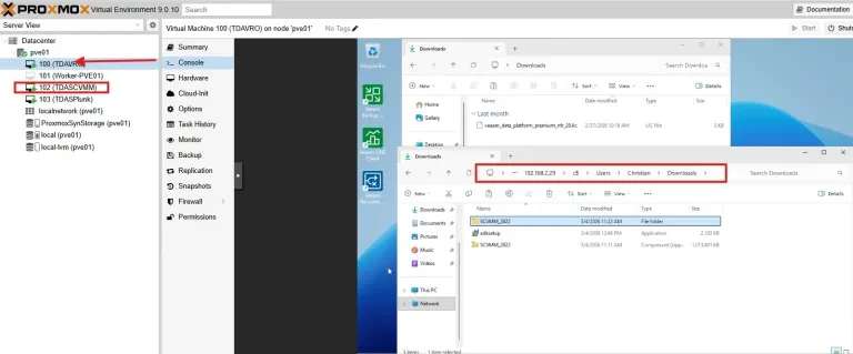 To do this, I will access the TDASCVMM server from the TDAVRO server using the Run dialog (Win + R) . Then connect via the administrative share, for example: \\TDASCVMM\\c$ or \\192.168.2.29\\c$