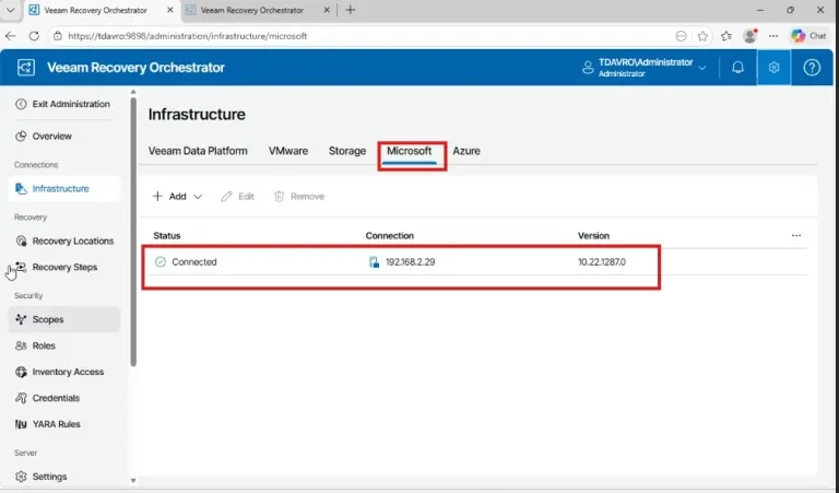 Note: Before adding a connection, ensure all Microsoft Hyper-V infrastructure objects are online. If you activate them afterward, Veeam Recovery Orchestrator may take up to 2 hours to synchronize and collect their data.