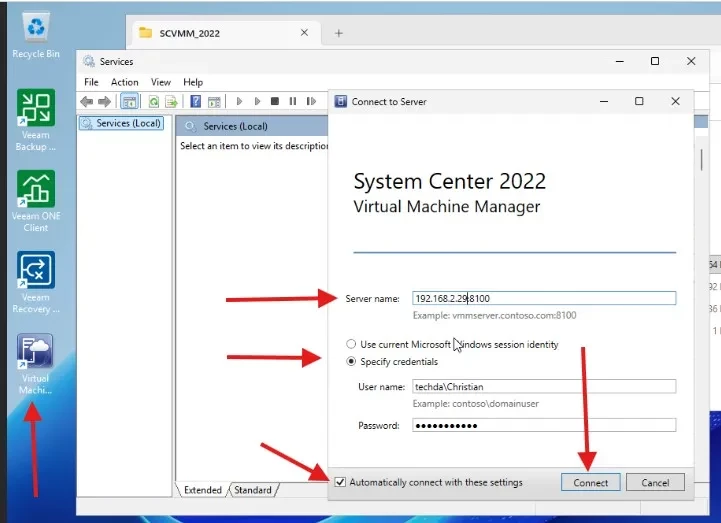 Since the VMM management server is not stored locally. We have to change from localhost to the remote server FQDN or IP Address, and then specify the credentials.