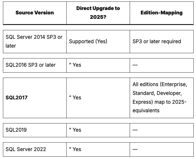 Kindly refer to this guide “SQL Server 2025 Upgrade Requirements and Compatibility” for extended details and edition changes in SQL Server 2025.