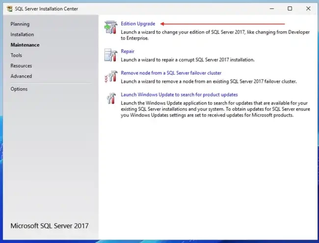 This is open the SQL Server Installation Center. To proceed, navigate to “Maintenance”, and click on the Edition Upgrade as shown below.