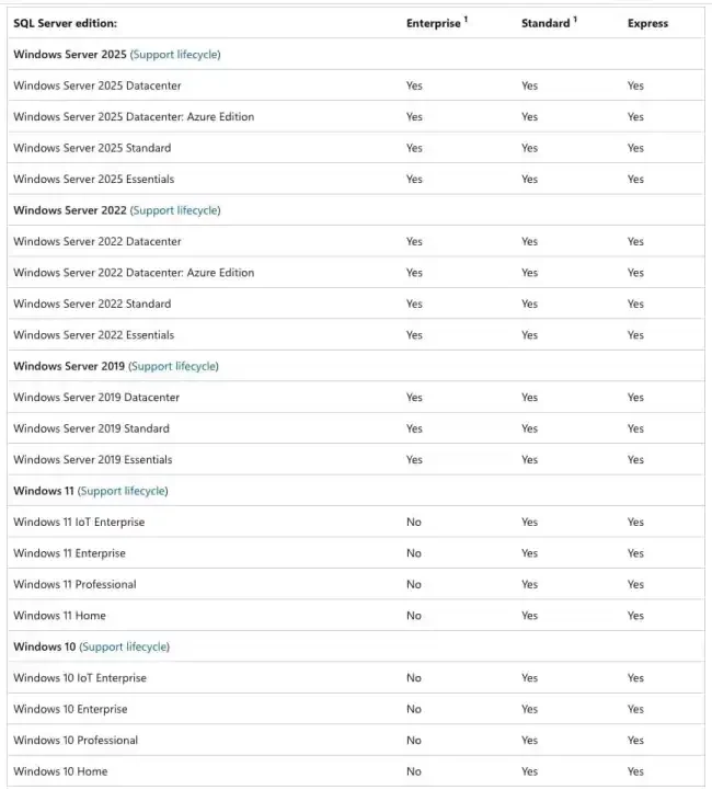 Upgrading SQL Server requires adequate planning. A smooth upgrade depends on validating hardware, security configuration, and feature support before performing the upgrade. The image below shows which editions of SQL Server 2025 (17.x) are compatible with which versions of Windows.