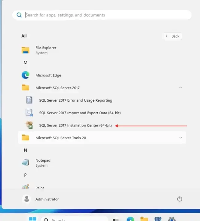 Launch SQL Server Installation Center by navigating through the start menu, Microsoft SQL Server 2017 and then click on the SQL Server Installation Center.