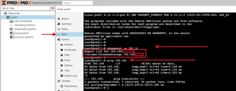 You can confirm export and this verifies that the NFS share on the NAS is accessible from the Proxmox host and correctly exported for Proxmox or client use.