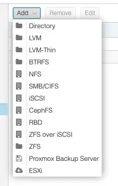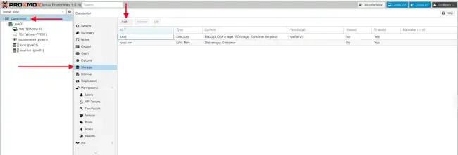 Log in to Proxmox Web UI via the URL with port 8006. Navigate to the Datacenter, then Storage and click on Add.