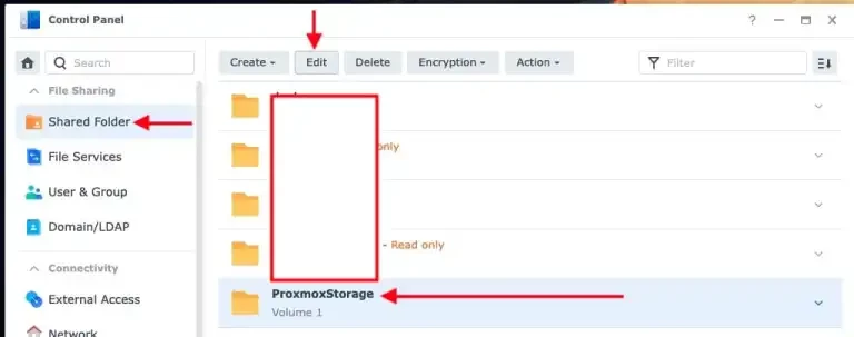 We have successfully created our shared folder. You can configure the NFS permissions of the shared folder before using your NFS client to access it or present it to Proxmox. To do this, select the folder and click on Edit.
