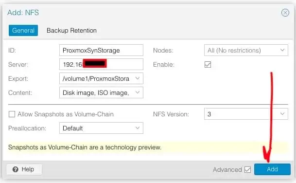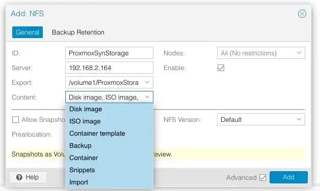 Enter the ID, server IP and under Export. Hit the Synology shared folder path (e.g. /volume1/ProxmoxStorage) you have created. For the content type, I will select all for my Lab usage.