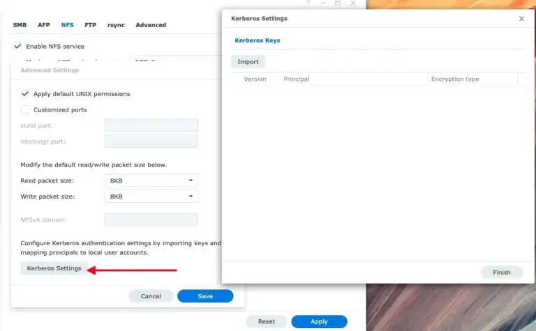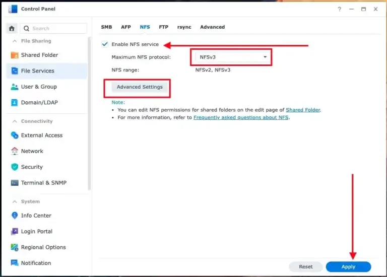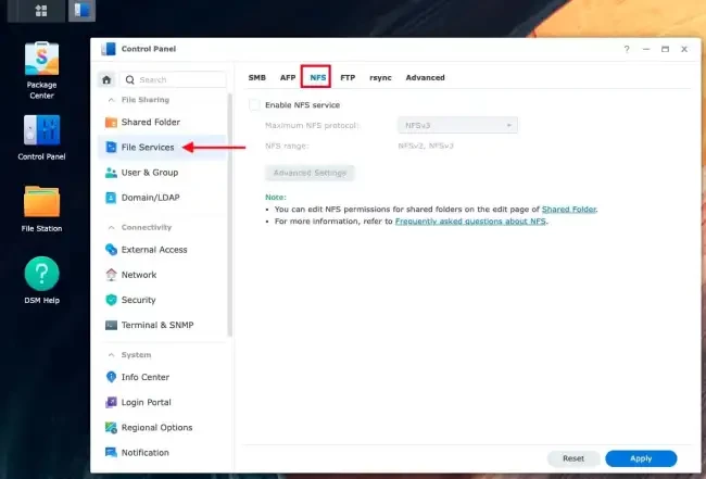 To access a shared folder with your NFS client. First configure your Synology NAS to allow NFS sharing. To do this, launch the Control Panel, click on File Services and then on NFS.