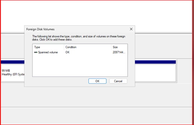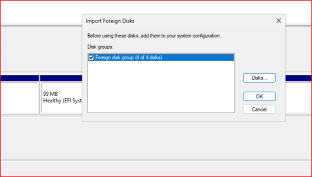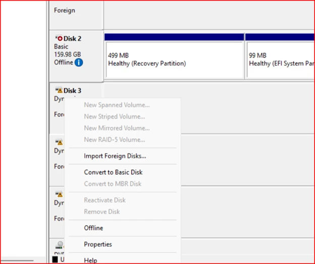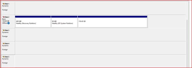 Once the disks were attached, I opened Disk Management inside the test VM, did a rescan, and saw the drives listed as offline. I brought them online (except the old system drive) and got a prompt that the disks were part of a foreign configuration.