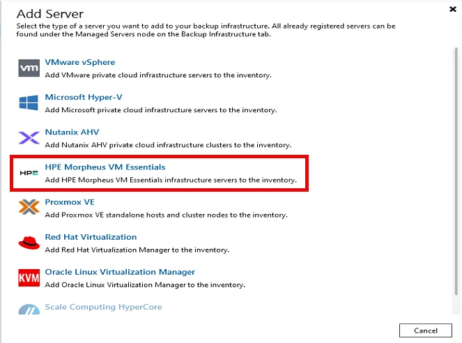 Right-click Backup ==> Virtual Machine ==> HPE Morpheus VM Essentials