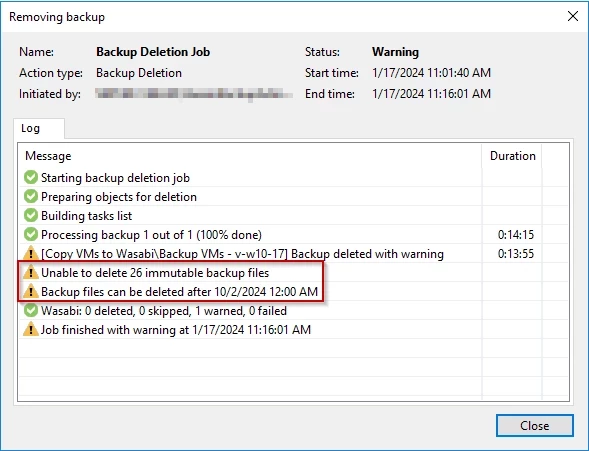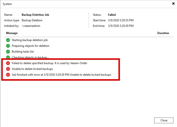Veeam will start the deletion job and attempt to delete the backup. As you can see the job failed with an error that it's used by Veeam-ootbi repository, and unable to delete locked backups.