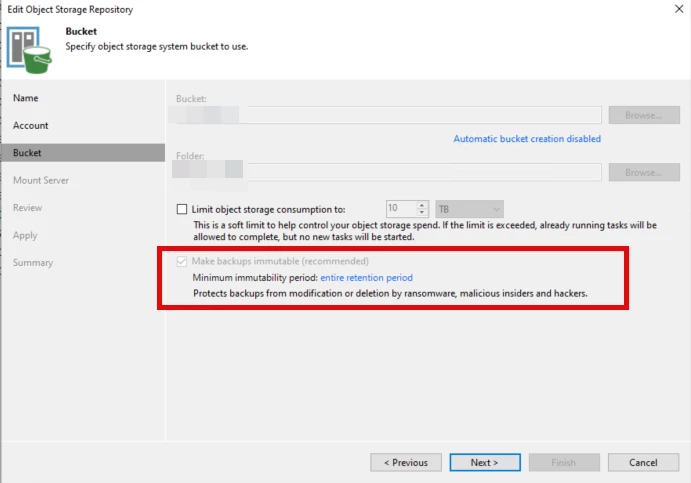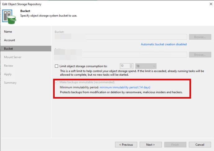 During repository configuration, immutability can be enabled directly in Veeam Backup & Replication.