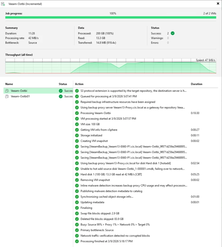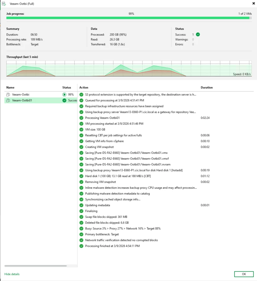 Once the repository was configured, I created several test backup jobs targeting the immutable object storage repository.
