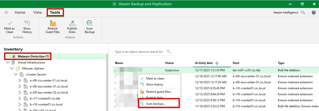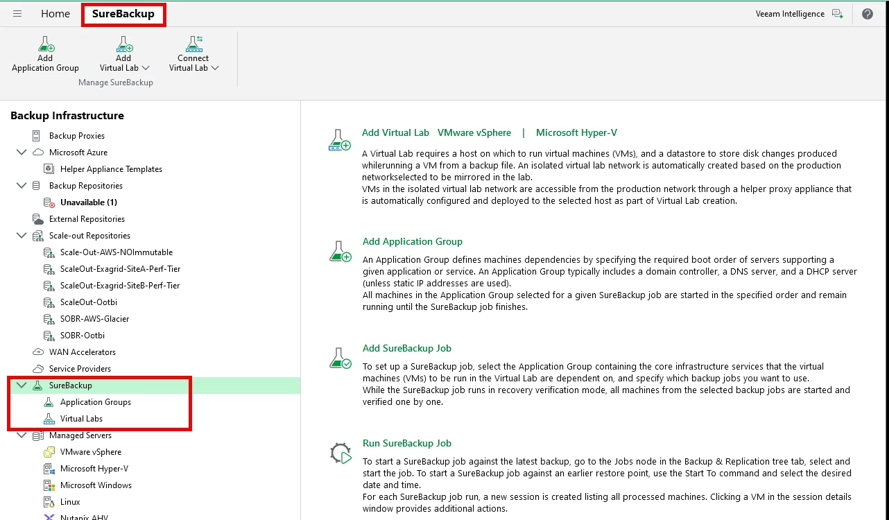 - Use SureBackup (if configured) to verify recoverability