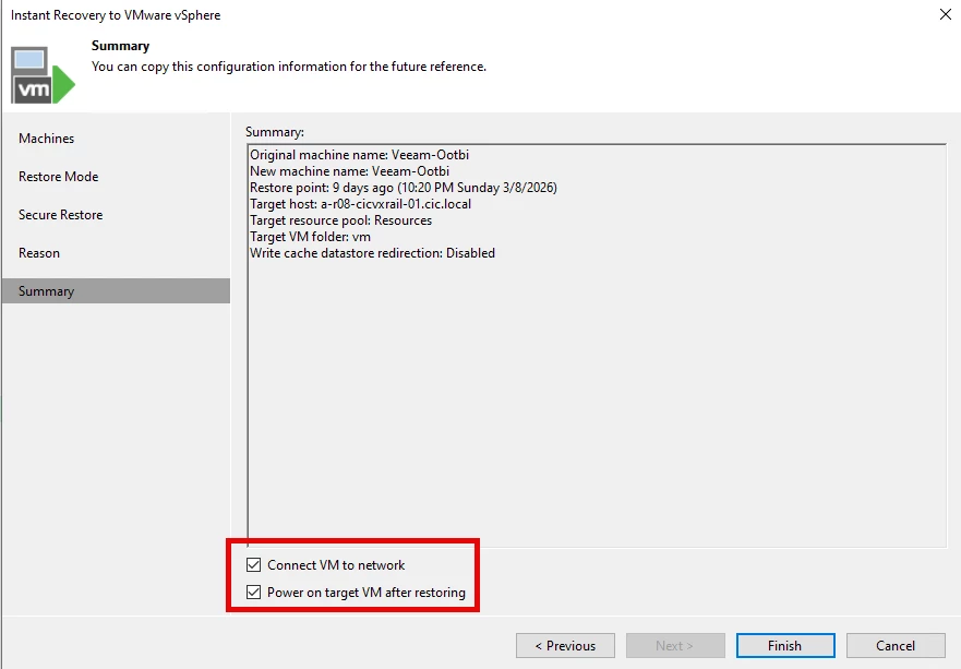 Make too sure to check "Connect VM to network & " Power on target VM after restoring", click FINISH