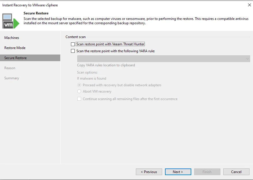 You can select to scan with Veeam Threat Hunter or Yara rule. For this test we'll leave this un-checked.