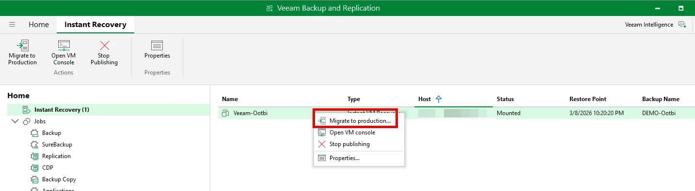 When ready to restore, right-click and select "Migrate to production." This will restore the entire VM back to the host.