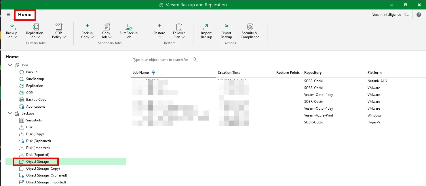 Login to the Veeam console ==> Navigate to Home ==> Backups and select a backup from Object Storage section