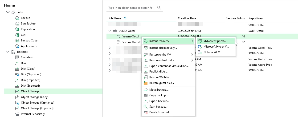 Right-click the backup "Veeam-Ootbi" ==> Instant Recovery ==> VMware