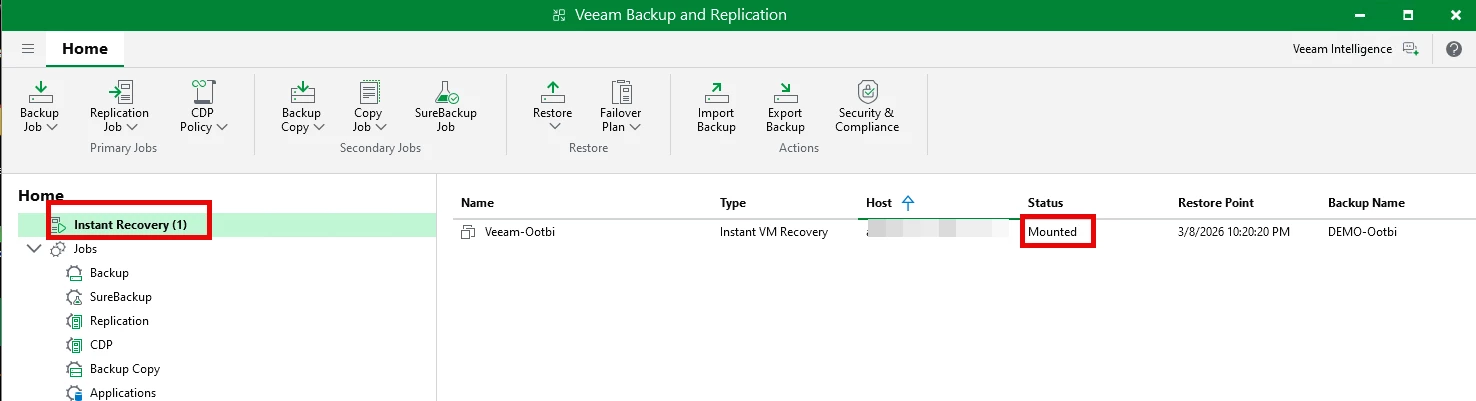 Upon completion you will see a "Instant Recovery" in the Home navigation ==> the VM is mounted to the ESX host