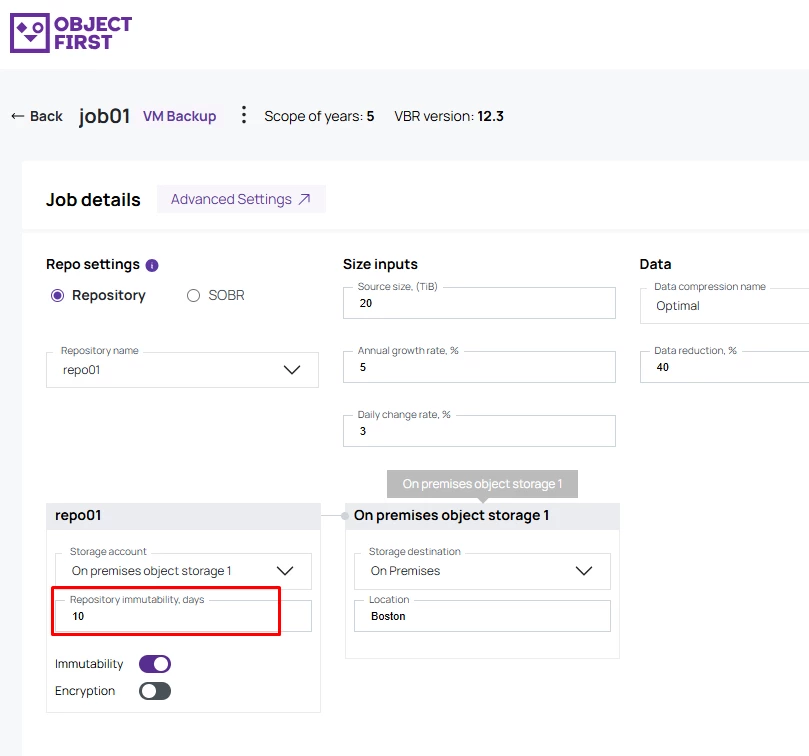 After choosing the bucket and creating a backup folder, you will select the Immutability option within the wizard and set the number of days to keep your backups immutable. Select “Make recent backups immutable for” and specify the number of days.