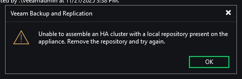 I have been working on a case with Veeam Support to do with HA Clustering and not being able to enable it due to this warning -