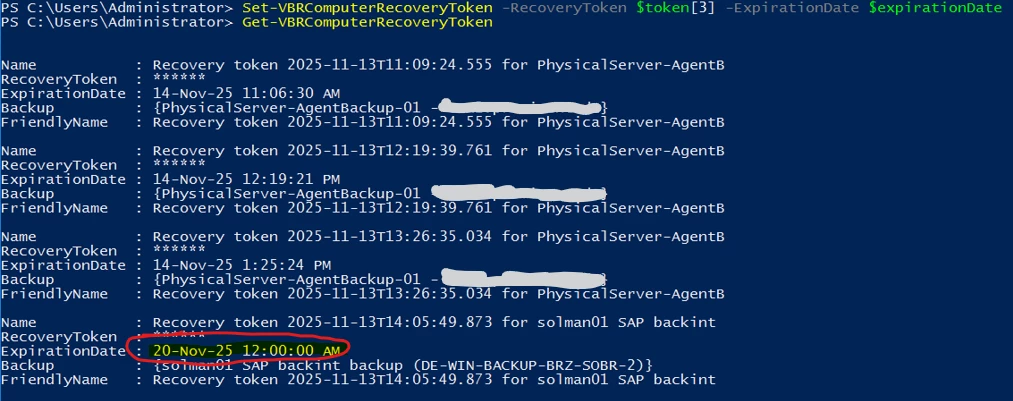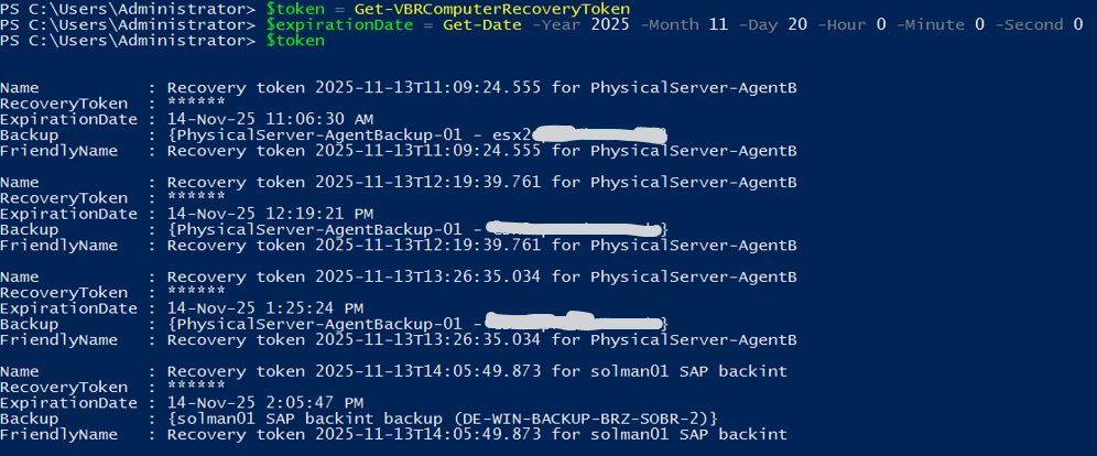 The process to prolong the validity is fairly easy. First, get all currently active tokens and put them into an array (e.g. $token) using “Get-VBRComputerRecoveryToken”. Also, we could directly set an expiration date in the correct format using “Get-Date”. $token will show the full array: