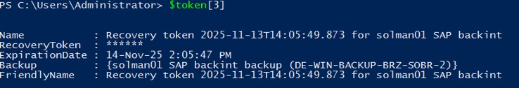 We can see four tokens currently valid. Let’s assume we would like to increase the validity of the SAP-HANA backup of solman01 in the example. This is the fourth item in the list. As it starts with [0], $token[3] will be our token: