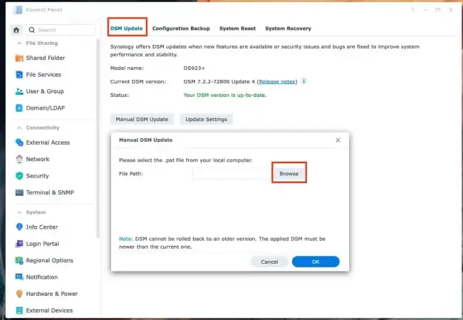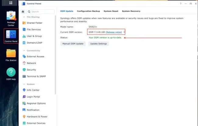 Navigate to Control Panel and then to “Update & Restore”. Click on Manual DSM Update as sown below.