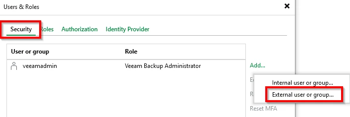 Now we can create the actual users/groups in VBR. Just add a new external user or group in those settings. Depending on what you configured on Authentik side. And select the role that you want the user or group to have.
