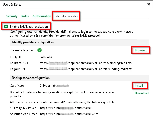 And you have to specify a SAML service provider certificate in Veeam. In my case I selected the existing self signed server certificate of the VBR server.