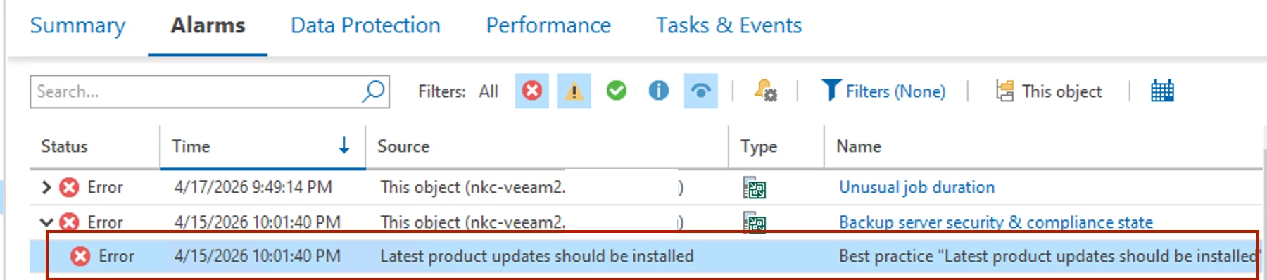 And then from there, when in VeeamONE, you will also get error Alarms for your added VBR Servers that they do not have the latest update installed, because VONE pulls this information from the VBR S&CA: