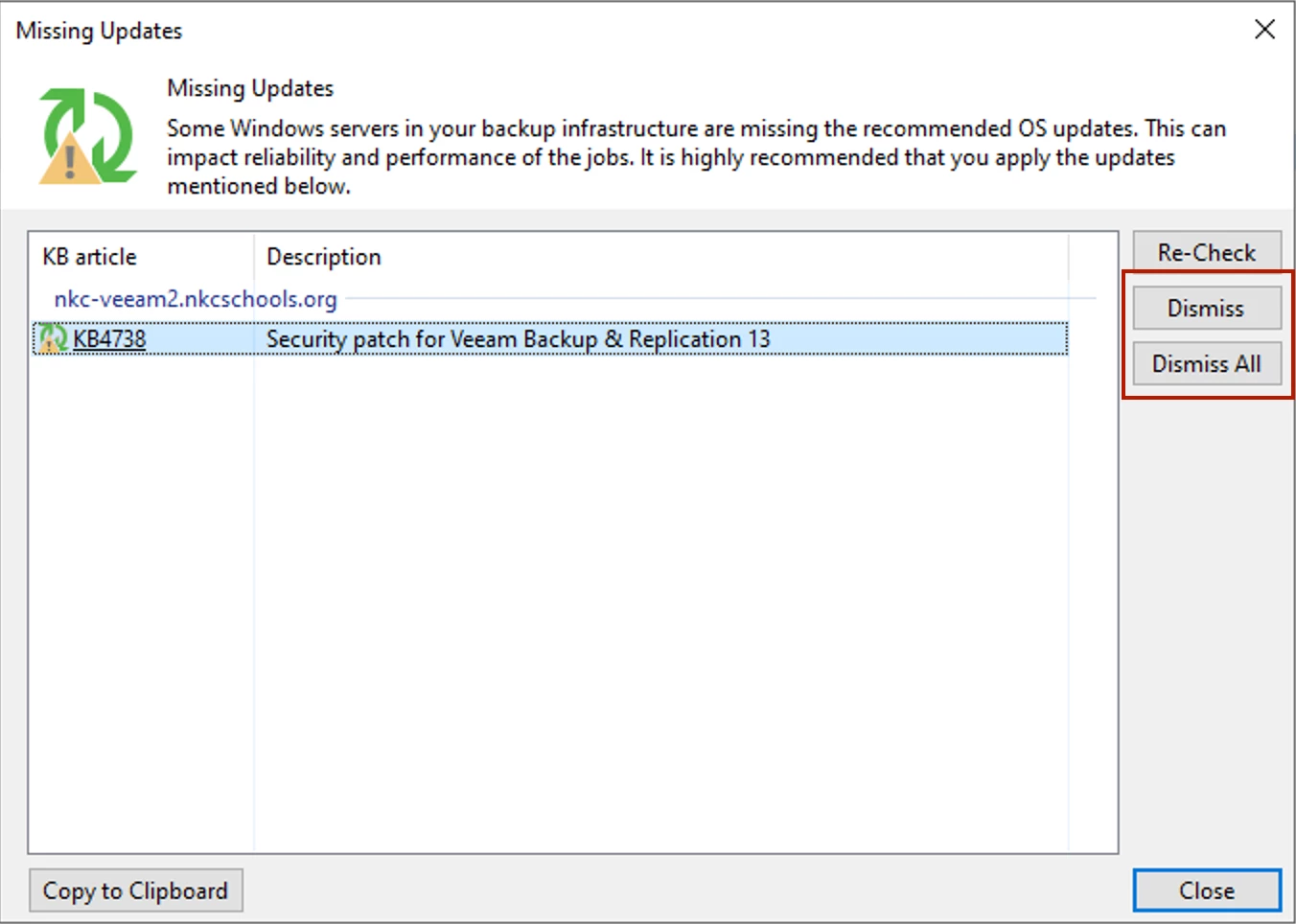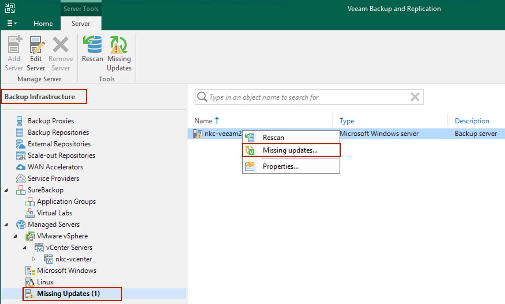 The resolution is easy enough. From the Backup Infrastructure View/Node > Managed Servers > Missing Updates , rt-click on your VBR server on the right and select Missing updates…
