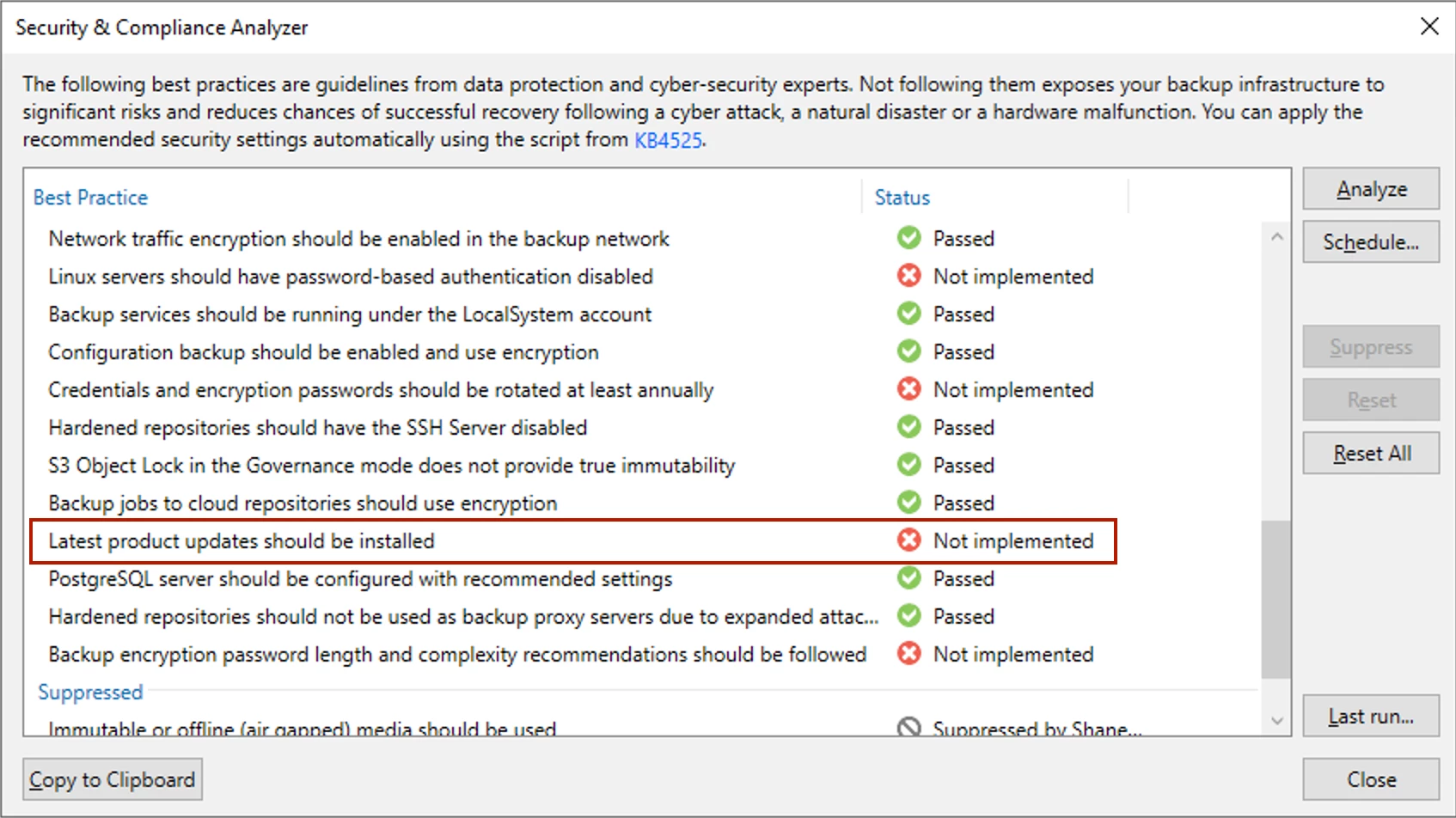 All good, but this is really just a bandaid to an underlying bug. Notice the Description above? As I shared initially, my environment is still on VBR v12, so the listed Description stating “Security patch for Veeam Backup & Replication 13” is a problem. This issue is slightly more than cosmetic sadly. This issue has a cascade effect. How? Well, not only is the VBR Console prompting you to update after logging in each time, the Security & Compliance Analyzer (S&CA) will also show your VBR is not up to date.