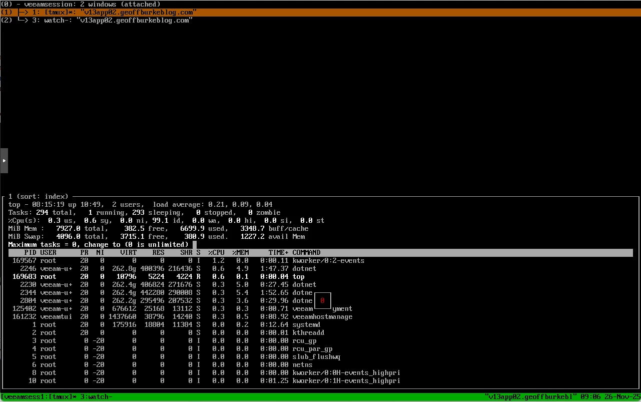 After following diligently the new process (caveat, this is my home lab where I wear many hats, in fact like all my jobs ever in IT :(, I am the security officer), asking the security officer for approval, I received access to the shell. Immediately I noticed the green. In fact I am lying I did not but a colleague at work mentioned it. Green here is not Veeam but Terminal Multiplexer which is now default in Veeam.
