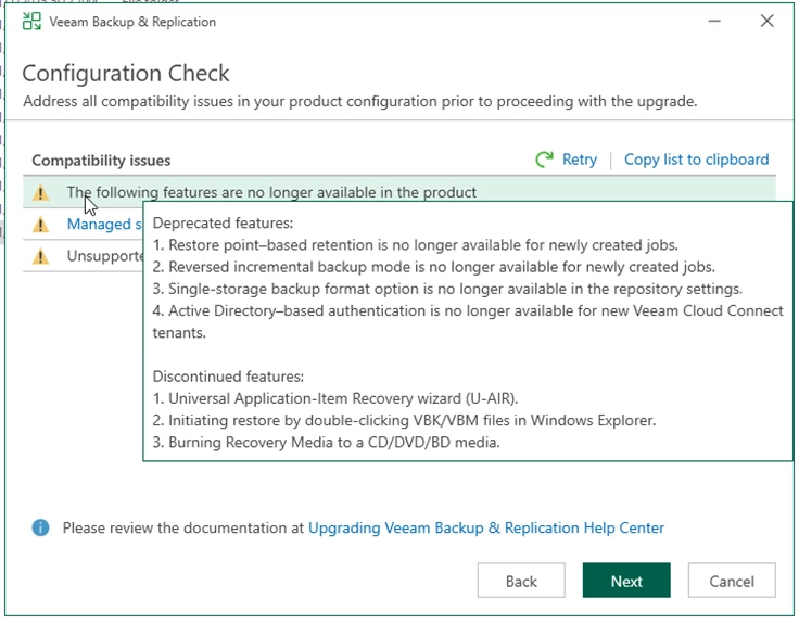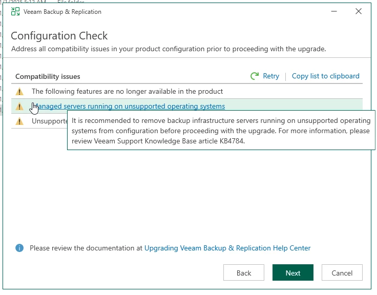 During Configuration Check, VBR scans your environment for anything that will not survive the move to v13. This helps prevent breakage after the upgrade.